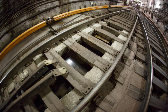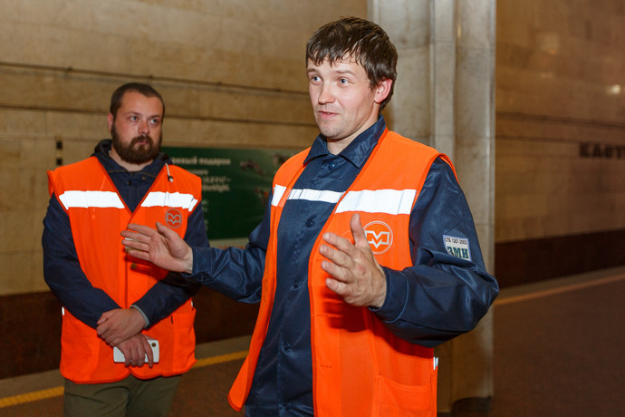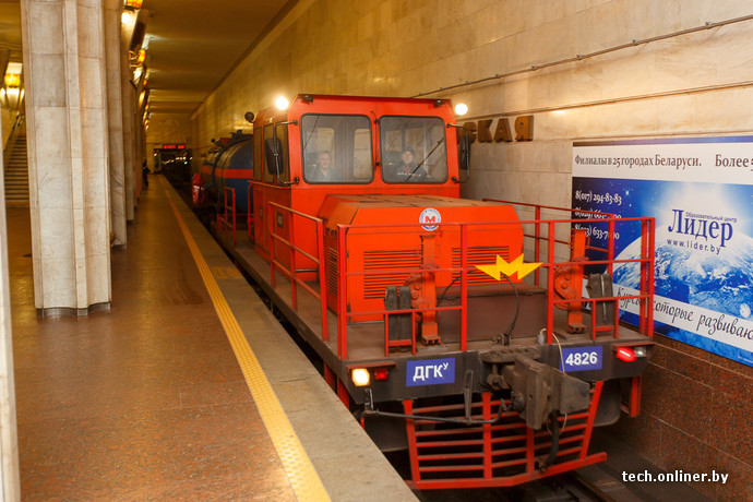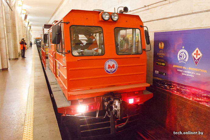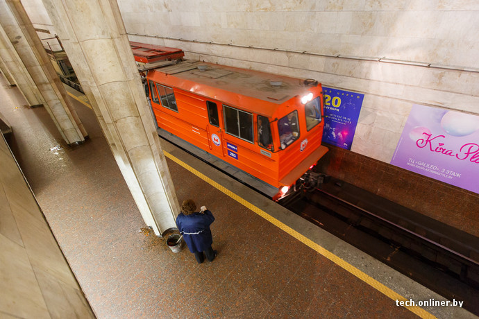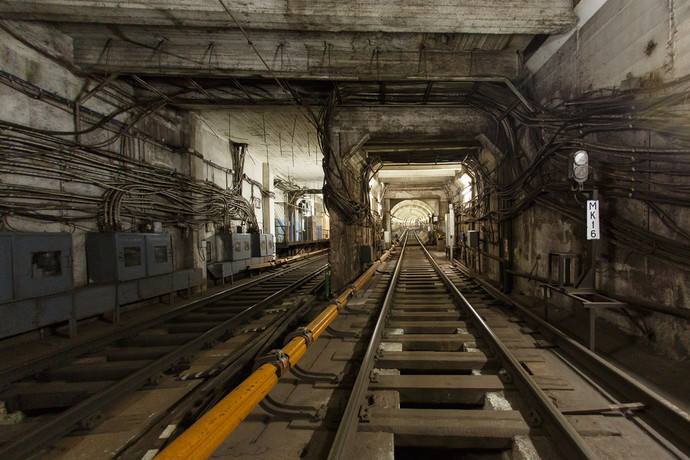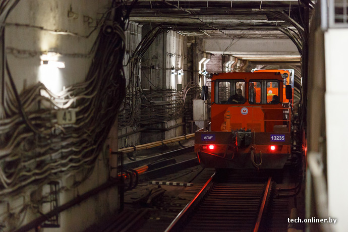 Перед тем как спуститься в тоннель, слушаем инструктаж и ждем прохода предназначенного для обслуживания межстанционных переходов хозпоезда. Непривычно красная для нашего метрополитена и работающая на солярке махина приезжает уже после отключения контактного рельса. Скорость небольшого состава вряд ли превышает 40 км/ч, зато тормозной путь составляет аж 50 метров. Если такая штуковина застанет человека в тоннеле, ему ничего не останется, как прижаться к одной из стен и покрепче ухватиться за что-нибудь. Поезд проедет всего сантиметрах в 20 от тела.