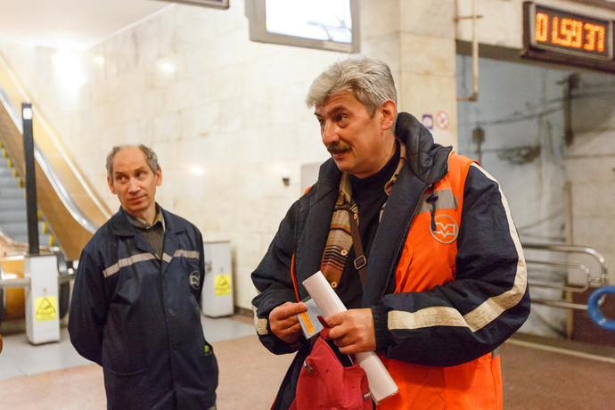 Работы много, а времени на нее — совсем ничего. В лучшем случае в тоннеле получится продержаться часа три, после чего надо спешно, еще до 5:00, вернуться на станцию. Тоннельный мастер Сергей рассказывает, что обычно проходит под землей по пять километров, от станции до станции и обратно. Бывает, надо проинспектировать состояние переходов от «Октябрьской» до «Площади Якуба Коласа» или «Института культуры», а потом вернуться. Как минимум один переход в смену пройти надо в любом случае. Сергей следит за состоянием отделки тоннелей, отслеживает возможные задымления или подтопления.
