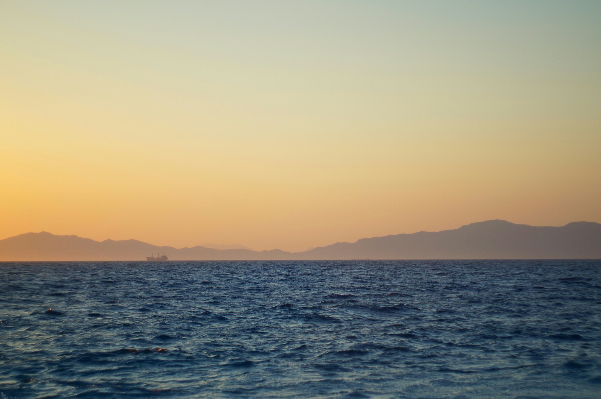 На горизонте — турецкие горы и неопознанный корабль
