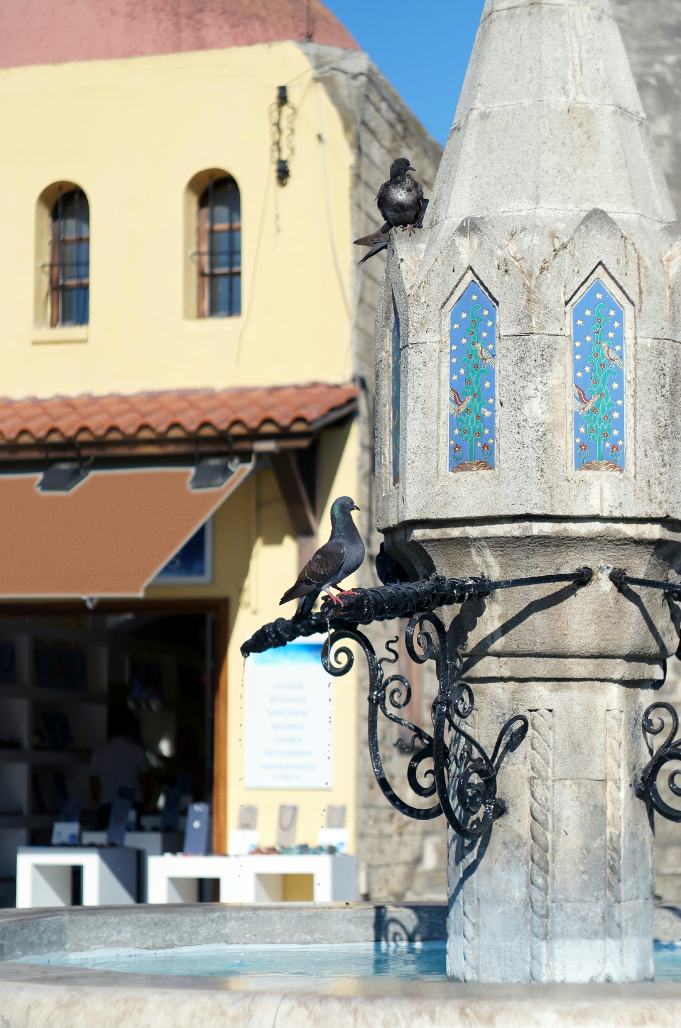 Почему-то на Родосе очень популярны фонтаны с краниками в виде голов драконовГлавной достопримечательностью Старого города по праву считается Дворец великих магистров. Не пожалейте денег и посетите его внутренние залы. Без экскурсовода это не слишком увлекательно, но все равно там есть на что посмотреть. Обратите внимание на мебель, геральдическую лепнину на стенах и мозаику на полу. Лично меня больше всего поразили витражи XIV века. На первый взгляд они похожи на обычные стеклянные окна, заляпанные разводами от строительных смесей. И только в конце экскурсии мы смогли разглядеть, что это самые настоящие витражи, сделанные не из стекла, а из тонких срезов камня! По приезде домой я потратил немало времени на то, чтобы найти информацию об этих витражах. Полагаю, вам тоже будет небезынтересно последовать моему примеру?