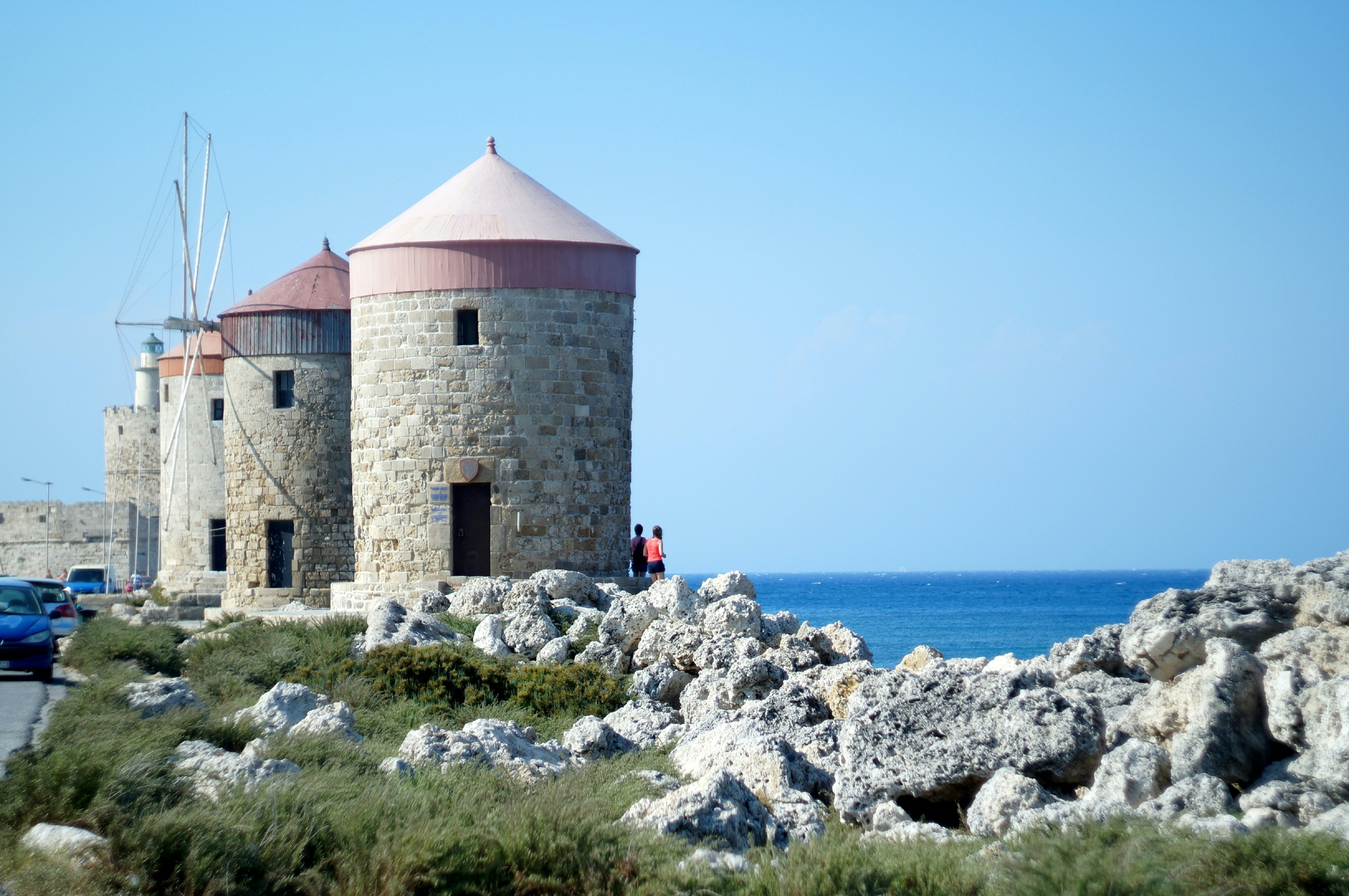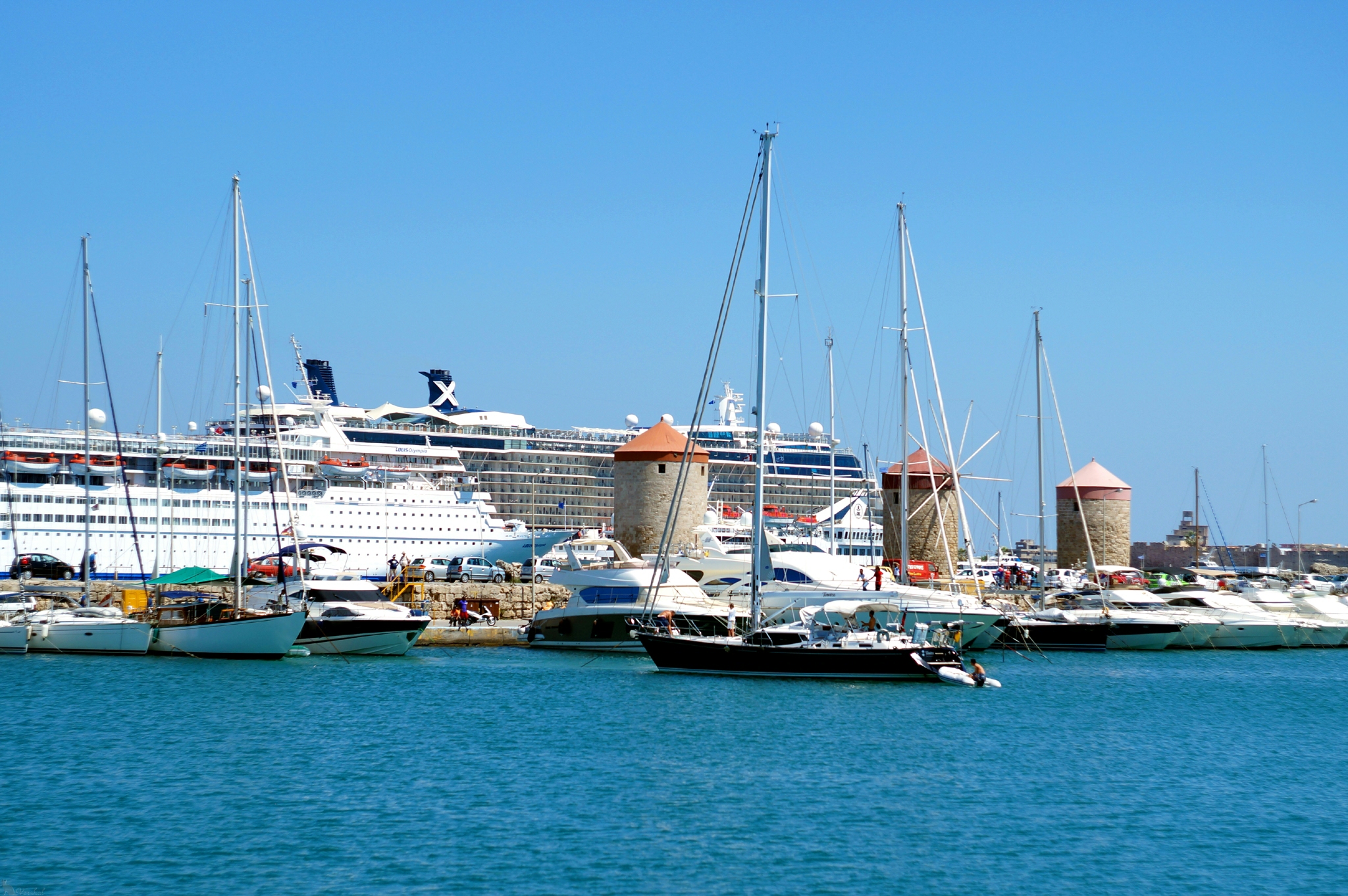 Мол гавани Мандраки с тремя мельницами. На заднем плане — форт святого Николая