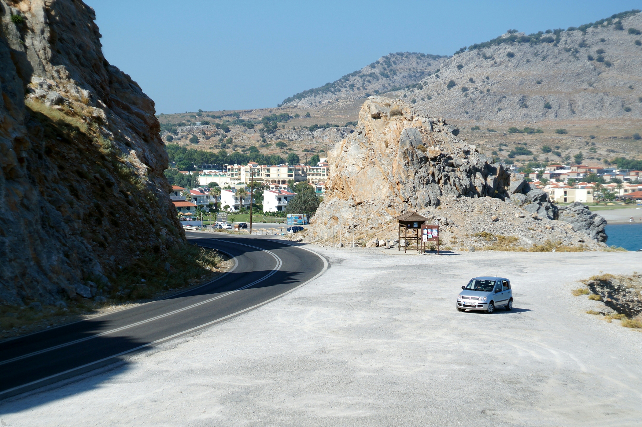 Fiat Panda, исправно вращая коленчатым валом, собирается отвезти нас к следующей точке маршрутаДороги на Родосе просто загляденье. В меру широкие, с хорошим однородным покрытием. Если на них и присутствуют следы ямочного ремонта, то сделан он не иначе как посредством какой-то магии, а не такой-то матери (как у нас), стыки таких заплаток совершенно не ощущаются! Если вы решите ехать на Родос с бумажной картой, не заезжайте в крупные, по островным меркам, города. Там много узких улочек с односторонним движением. Пропустив нужный поворот, вы будете вынуждены снова и снова, по кругу, выписывать кренделя, чтобы добраться до цели. Я бы советовал использовать для ориентировки на местности навигатор. В крайнем случае установите приложение iGO, чтобы превратить ваш смартфон в некое подобие навигатора.
