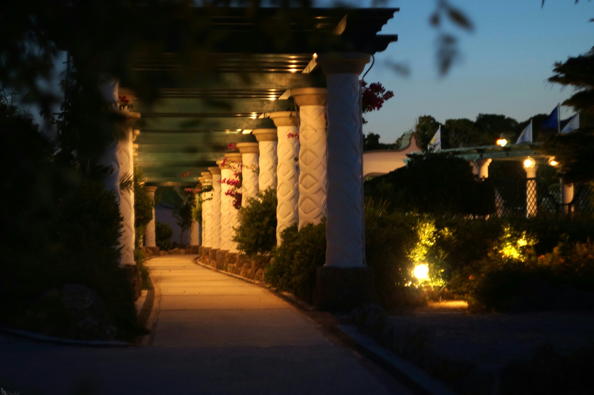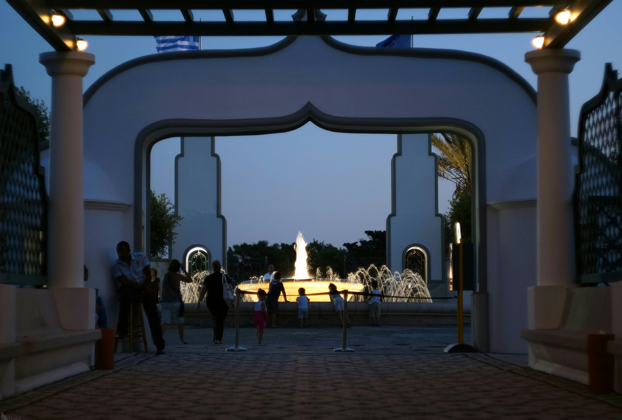 Одни из двух подъездных воротНа обратном пути, вечером, можно посетить термы Калитеи. Раньше здесь располагалась очень популярная водолечебница. Теперь это просто красиво оформленные территория и пляж. К сожалению, лечебных вод тут уже не осталось. Красотами ландшафта и гастрономией прибрежного кафе после захода солнца наслаждаются влюбленные парочки Homo Sapiens и Felinus.