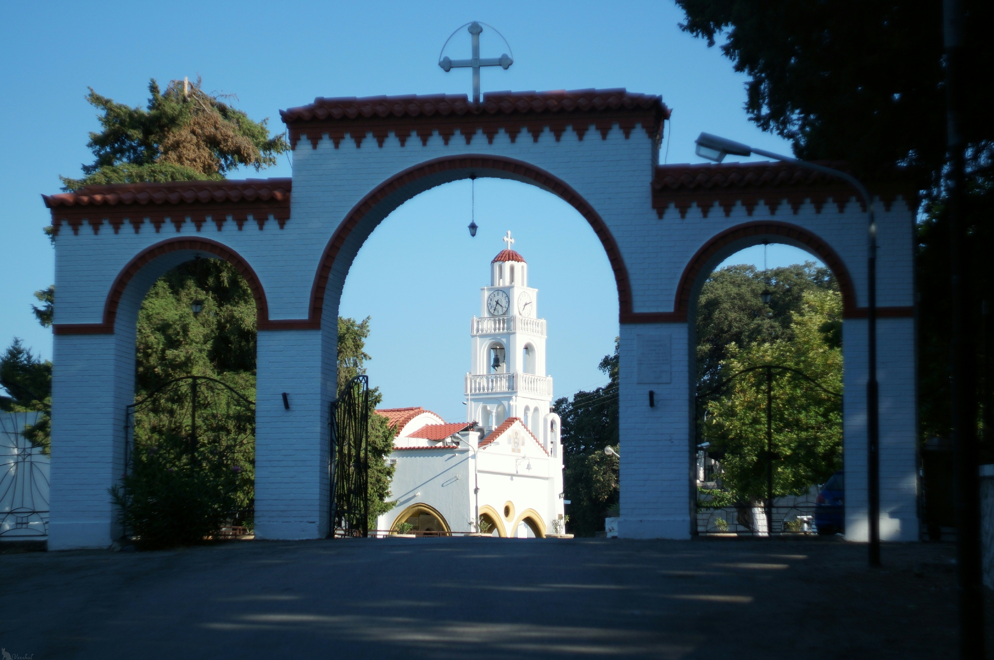 Холм Филеримос. Парковка. ПавлиныНа холме Филеримос расположен мужской монастырь. Павлины гуляют, что куры в наших деревнях. Никто, кроме туристов, не обращает на них внимания. Пожалуй, это самая обширная территория из всех, что мы видели на острове. Атмосфера и энергетика места просто потрясающие, прогулки в тени деревьев под стрекот насекомых и крики павлинов настраивают на философский лад. Со всего холма открывается богатая на «ох» и «ах» панорама северной оконечности острова. Тут же расположен завершающийся огромным крестом формальный путь на Голгофу, куда также можно подняться. Ну как подняться… по лестнице пешком, а не по принуждению на гвоздях! Монахи, живущие здесь, изготавливают очень необычный ликер, настоянный на произрастающих тут же травах. Мы его, разумеется, приобрели.