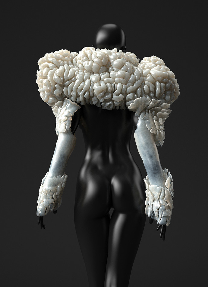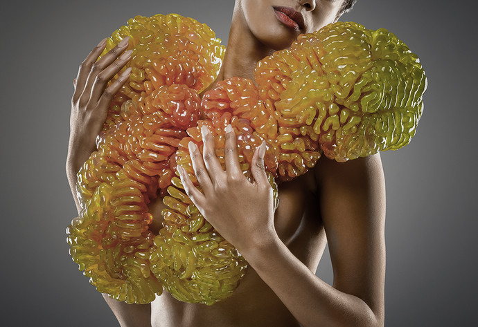 «Одни костюмы приспособлены для поглощения солнечной энергии, другие защищают человека и выступают в качестве экзоскелета», — пояснила Оксман. Так, один из костюмов представляет собой внешний пищеварительный тракт, предназначен для циклической переработки питательных веществ и способен получать энергию от солнечного света (согласно замыслу дизайнера). Есть и другие, не менее экзотические, в том числе съедобные «скафандры».