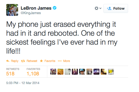 Однако накануне спортсмен огорчил Samsung, опубликовав в своем Twitter сообщение: «Мой телефон только что удалил все данные и перезагрузился». Леброн Джеймс также добавил, что пережил один из худших моментов в своей жизни.