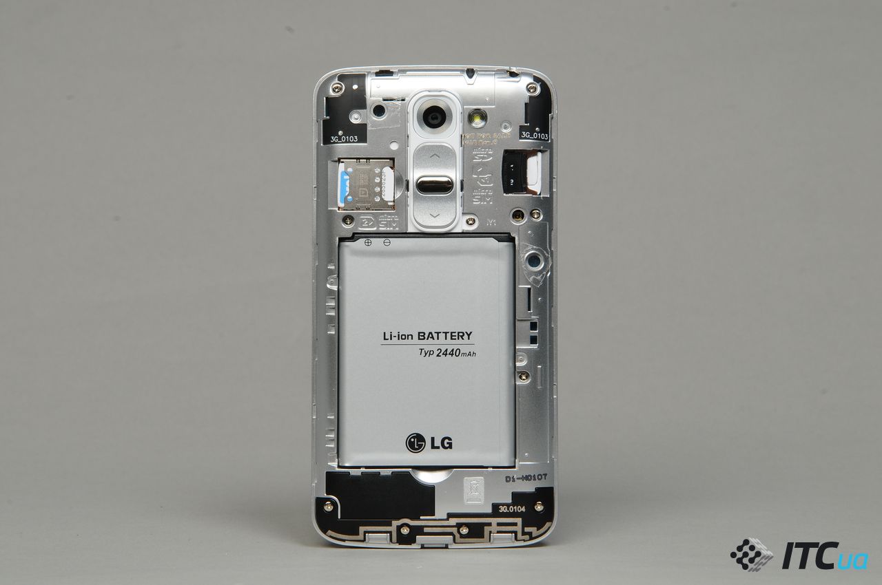 Под съемной панелью прячется аккумулятор емкостью 2440 мА*ч и три слота, два для Micro-SIM и один для MicroSD.