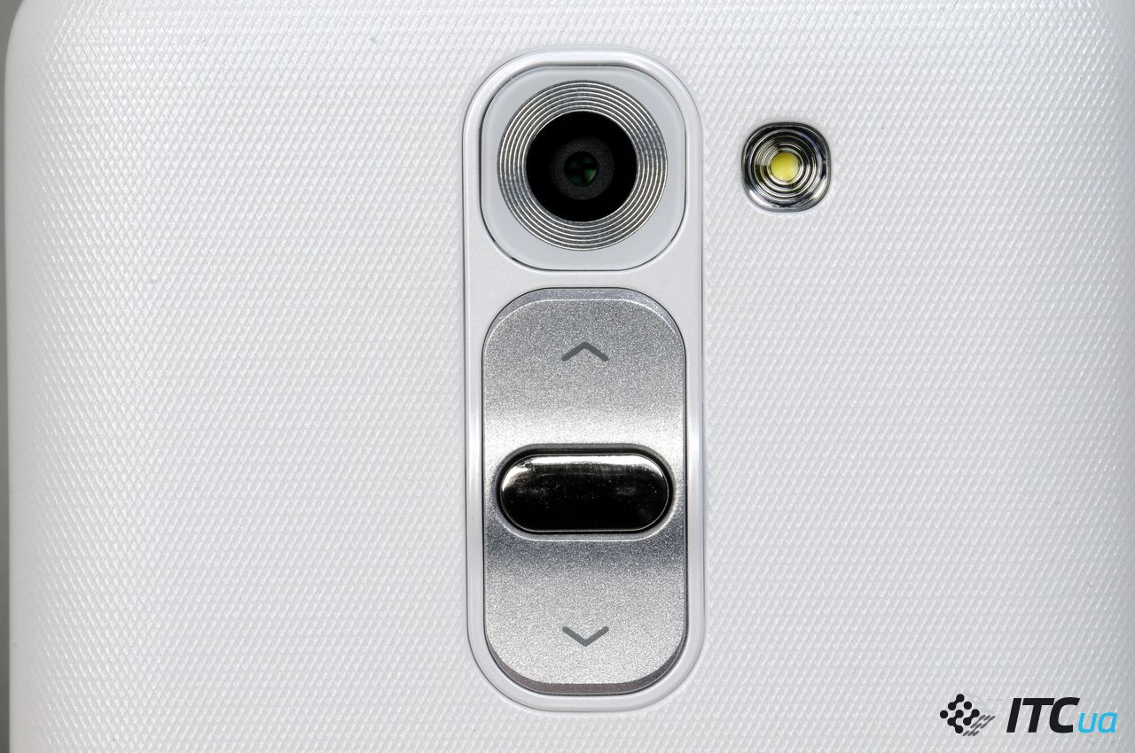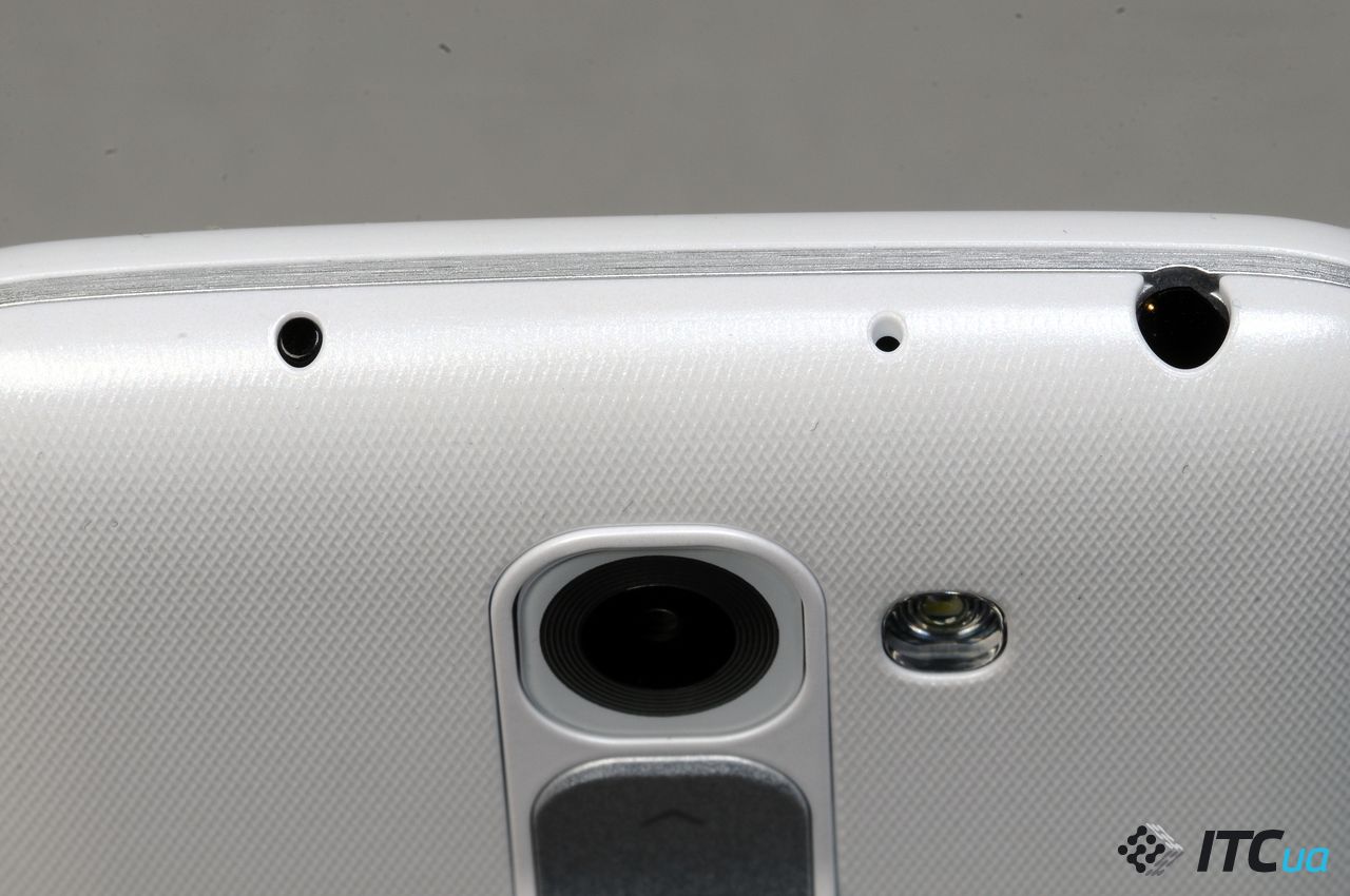 Съемная панель тыльной стороны закрывает всю ее поверхность. Выполнена она из матового пластика с фактурным узором. В крышке проделано два отверстия: одно для объектива основной камеры и блока клавиш, второе для вспышки. Края клавиш отвечающих за регулировку громкости слегка приподняты, что помогает в их обнаружении вслепую. Еще сильнее над поверхностью корпуса выступает глянцевая клавиша питания/блокировки. Клавиши громкости имеют короткий, и едва ощутимый клик, тогда как для срабатывания клавиши питания нужно приложить больше усилий, правда и отдача при этом немного больше. Кроме управления громкостью, клавиши могут выполнять и другие задачи, например, нажатие верхней клавиши в спящем режиме вызывает приложение QuickMemo, а нижней – запускает камеру. При запущенной камере обе клавиши могут быть использованы для фиксации кадра или записи видео.